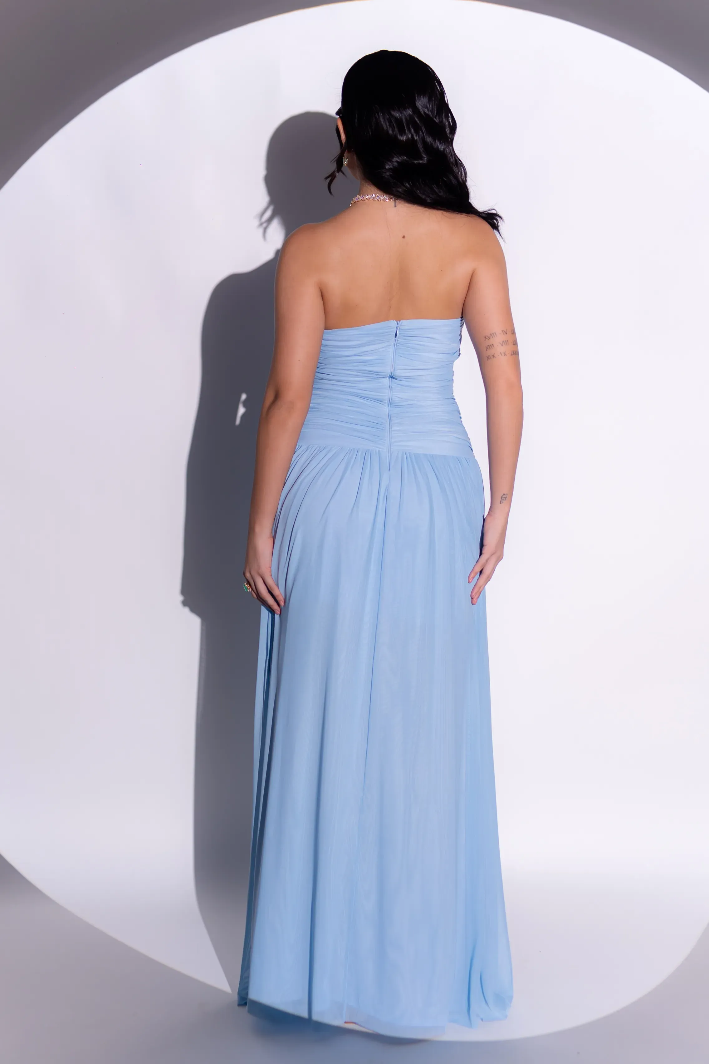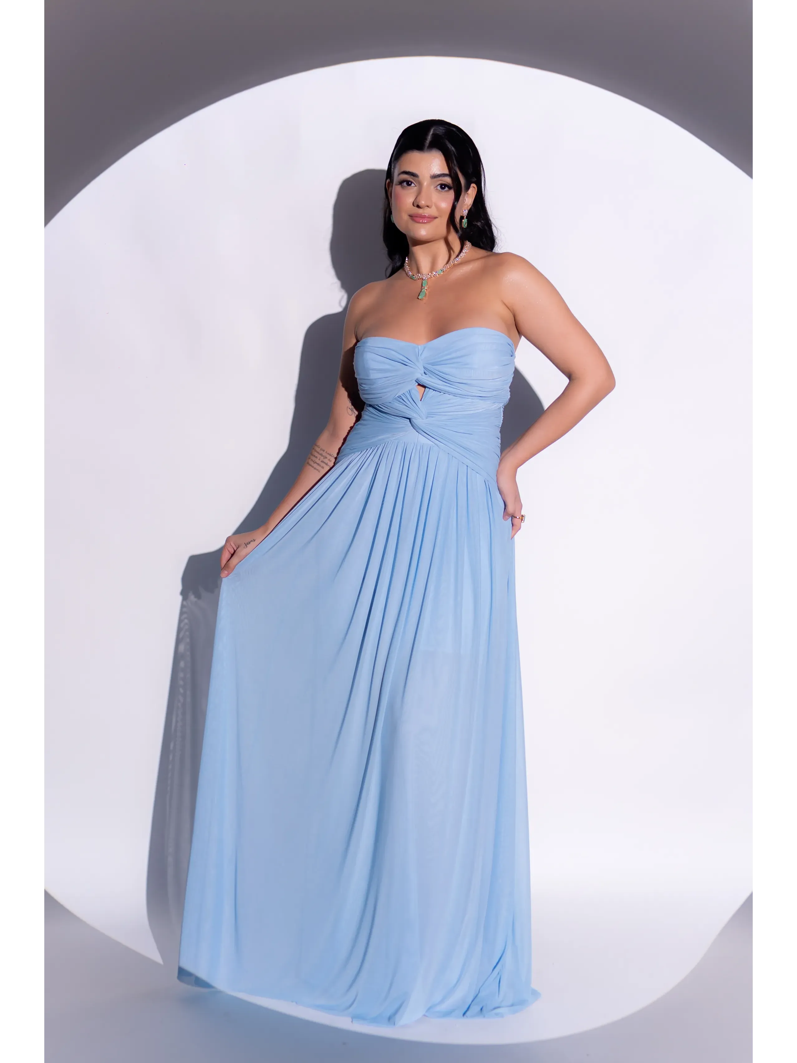 Vestido de festa longo azul serenity tomara que caia com tecido transpassado no busto e saia plissada
