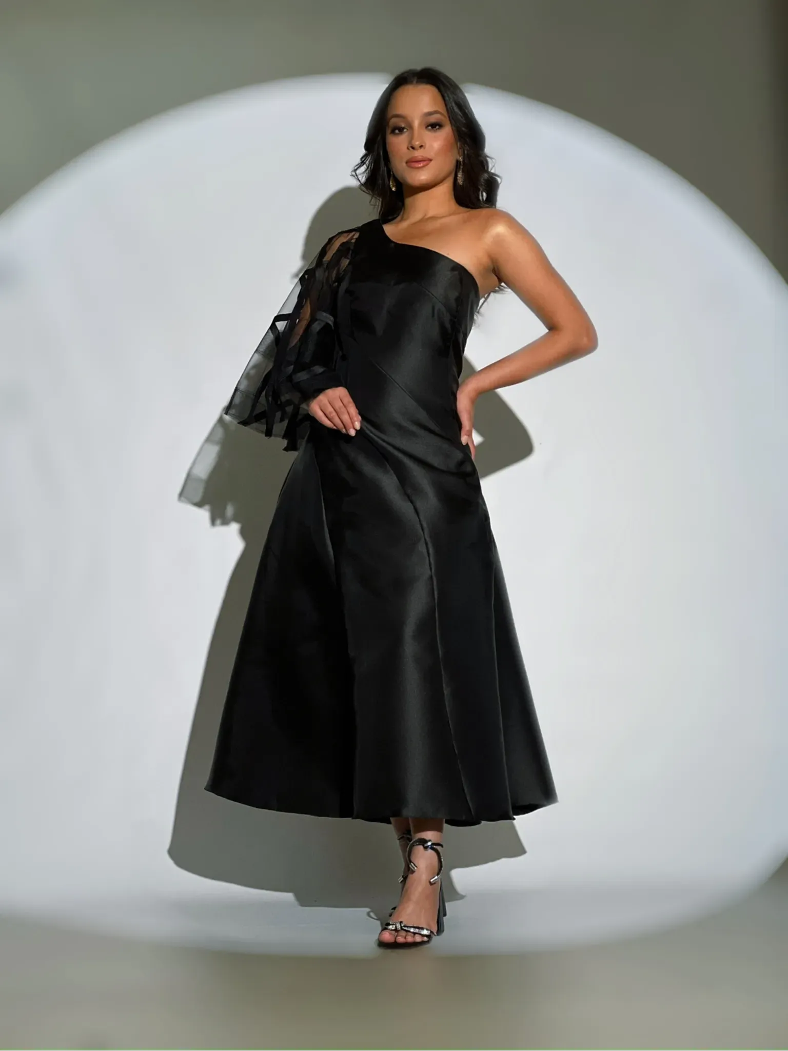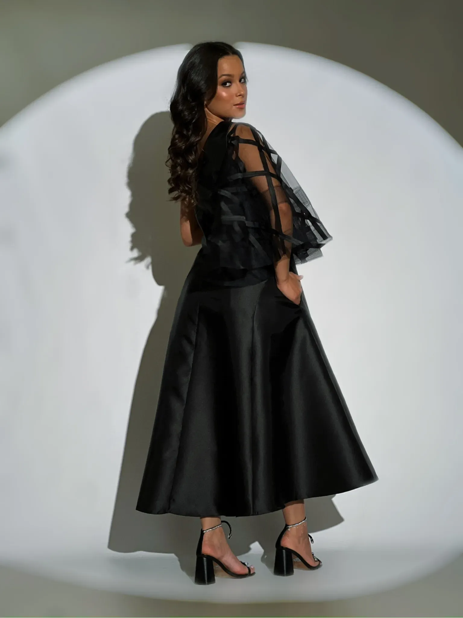 Vestido de festa midi preto modelo nula manga com detalhes em viés e bolso