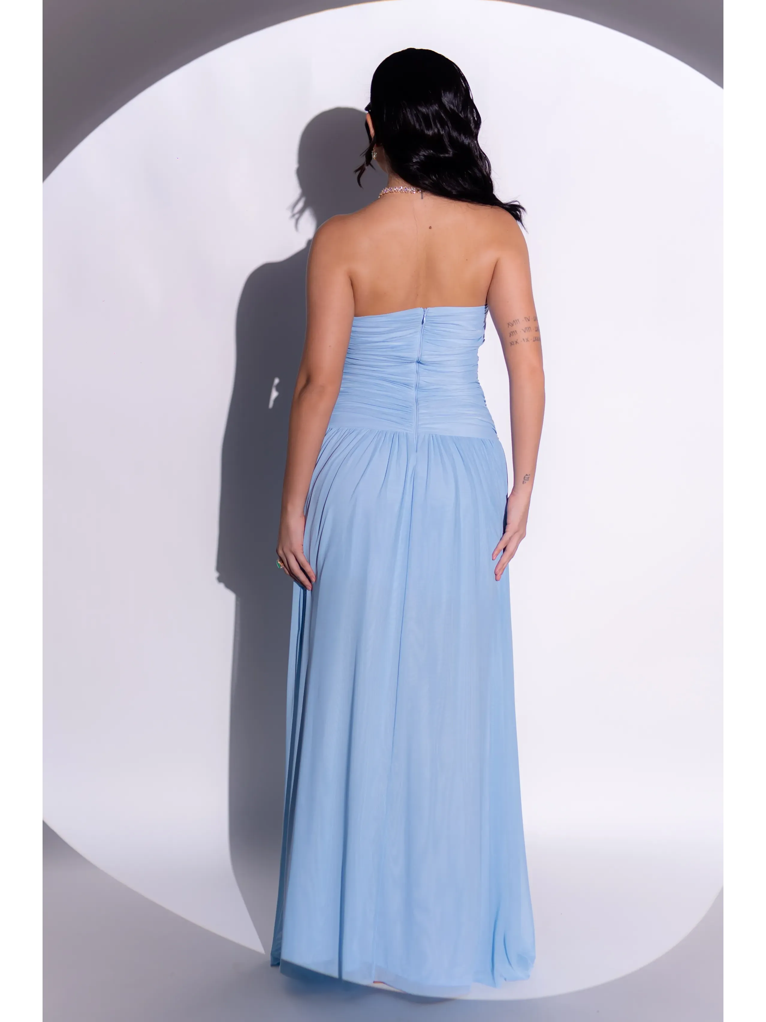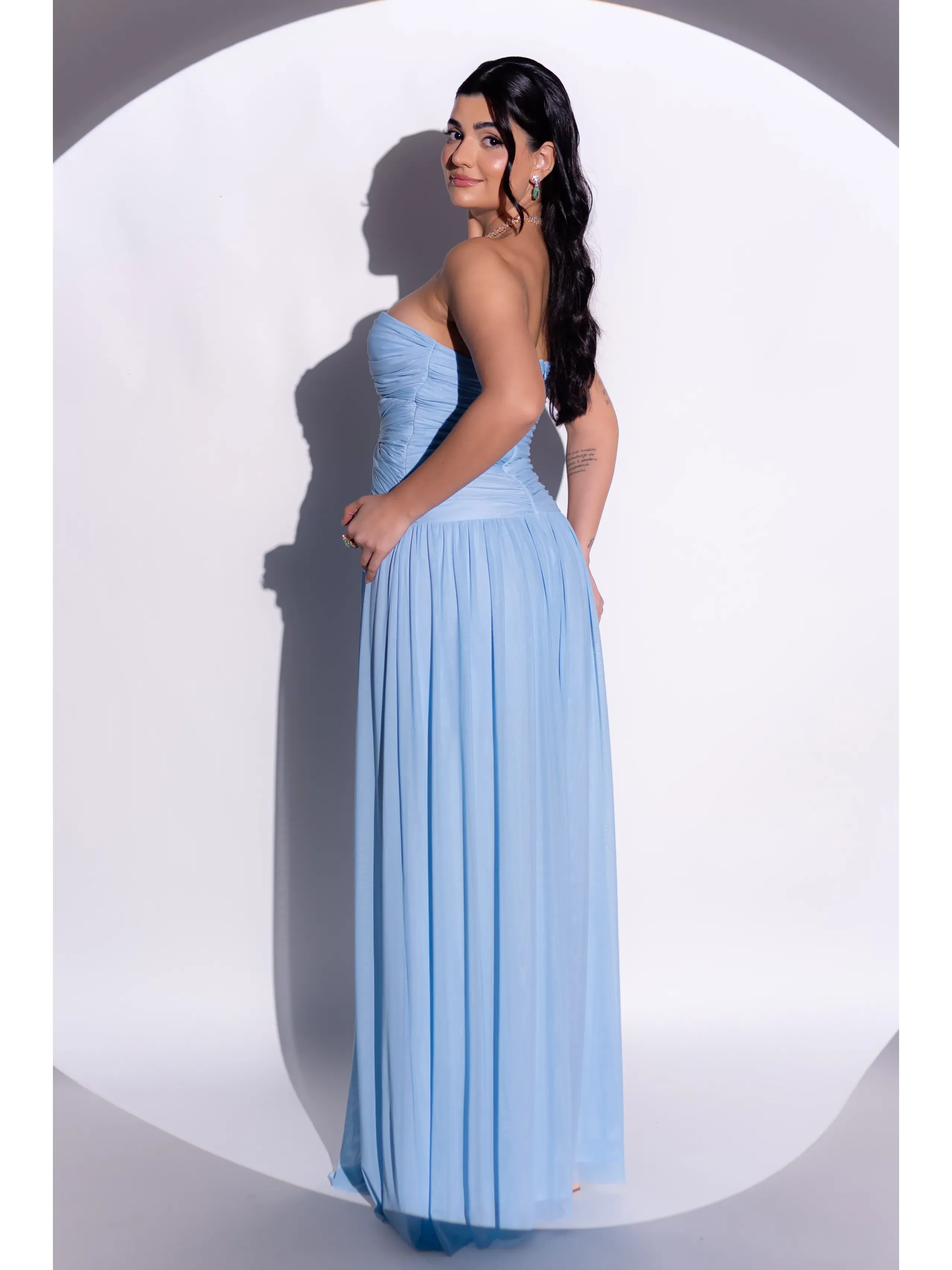 Vestido de festa longo azul serenity tomara que caia com tecido transpassado no busto e saia plissada