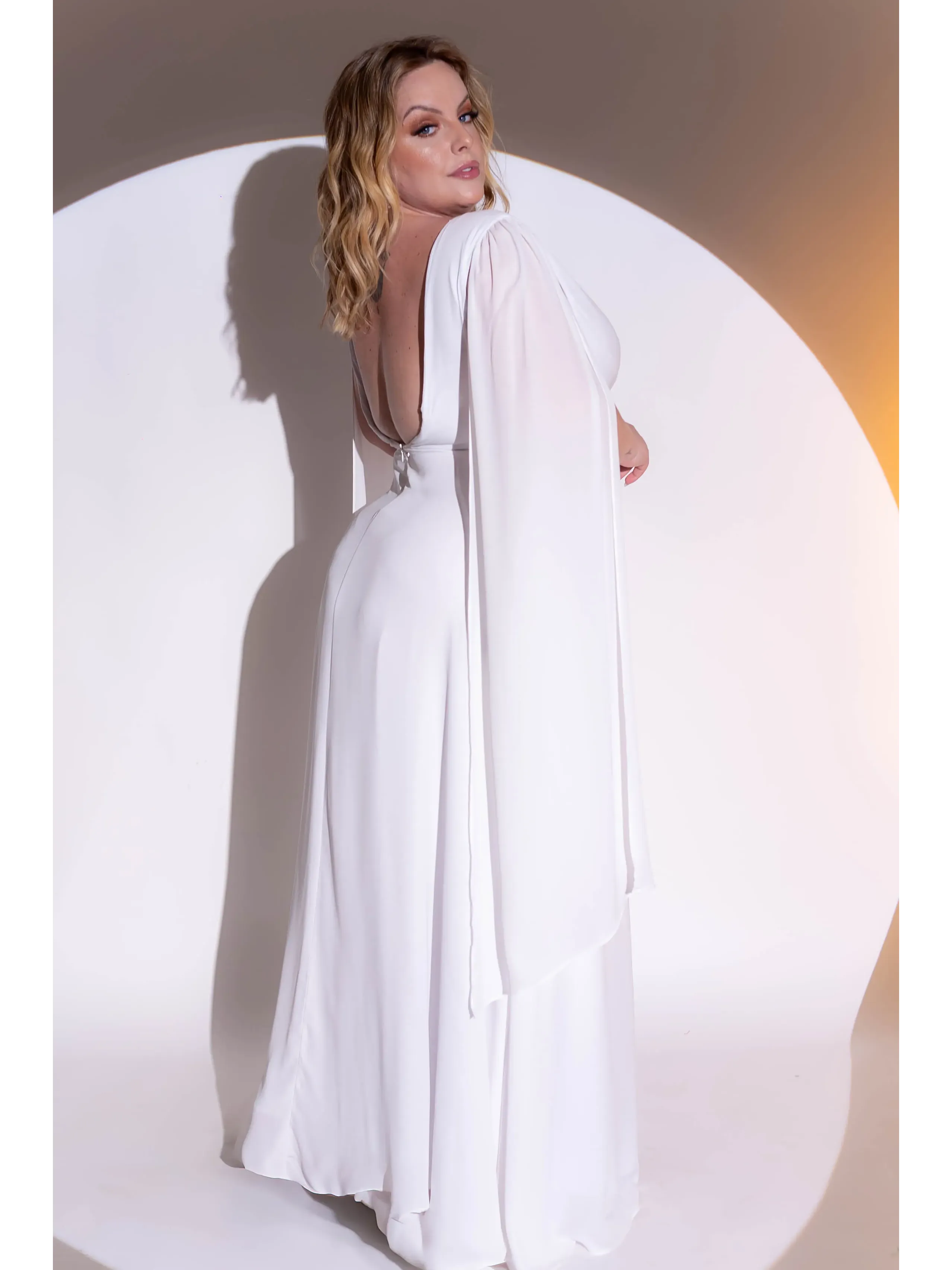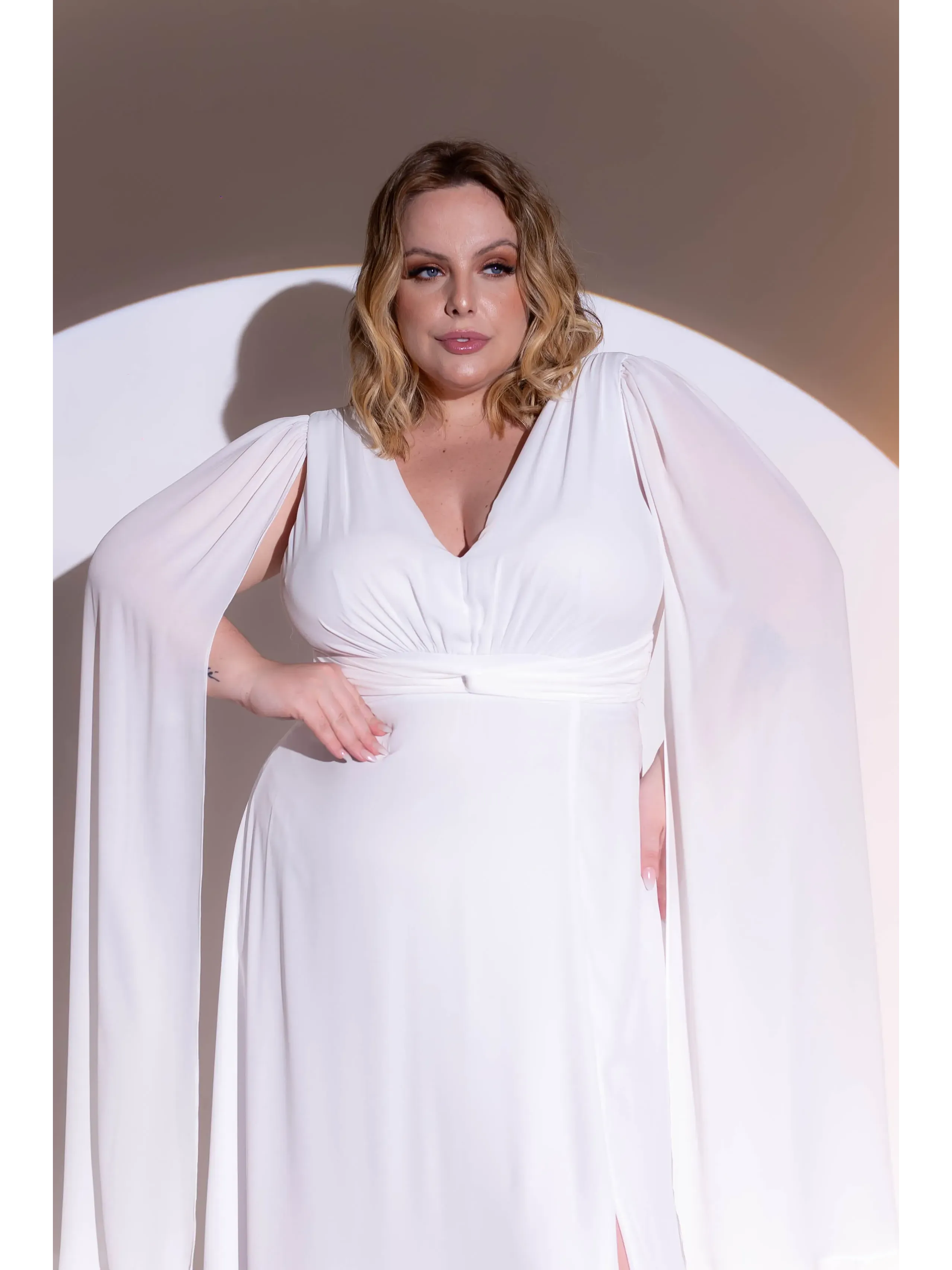 Vestido de noiva longo branco tecido em toque de seda com mangas longas cinto e fenda na saia