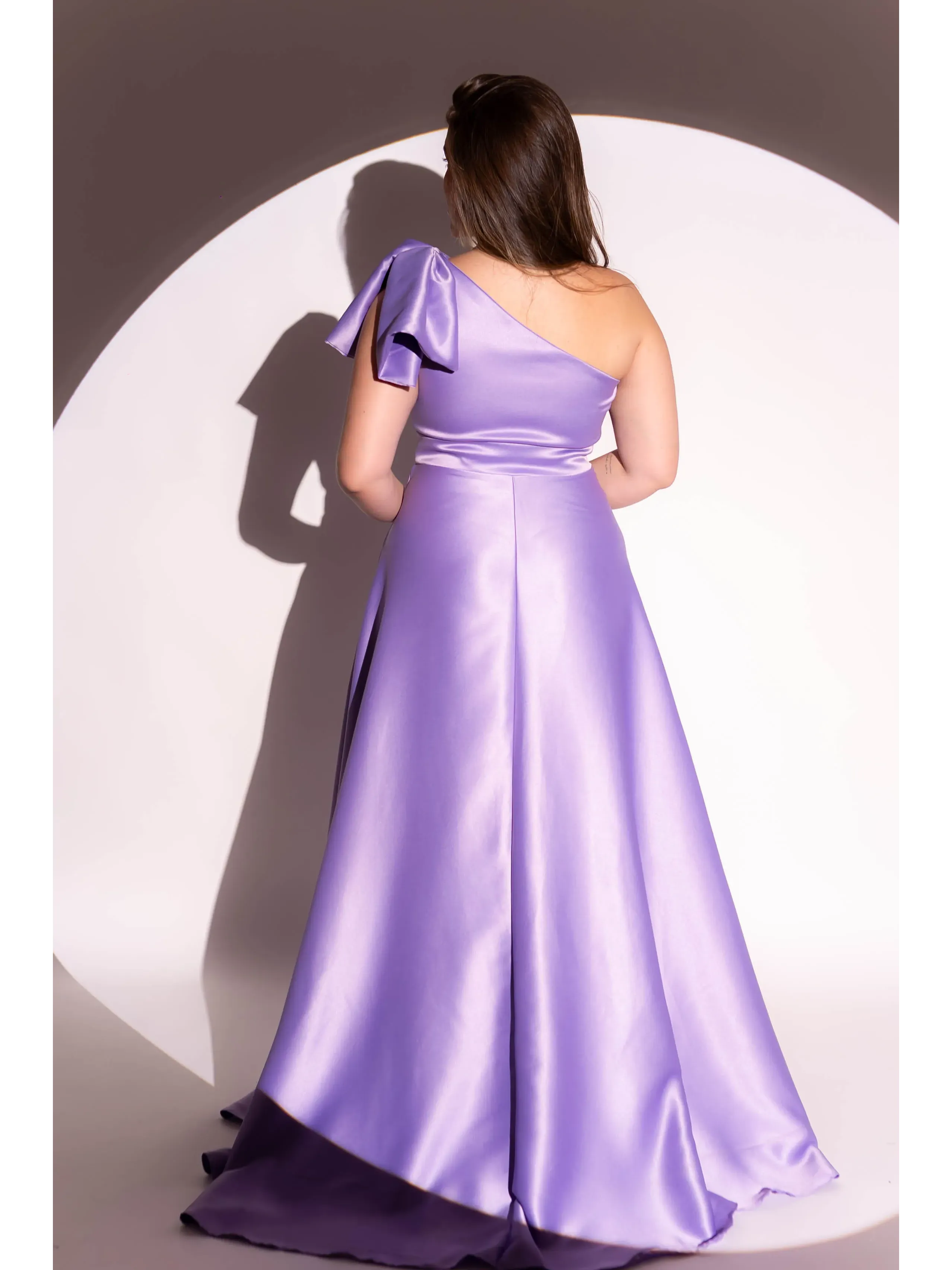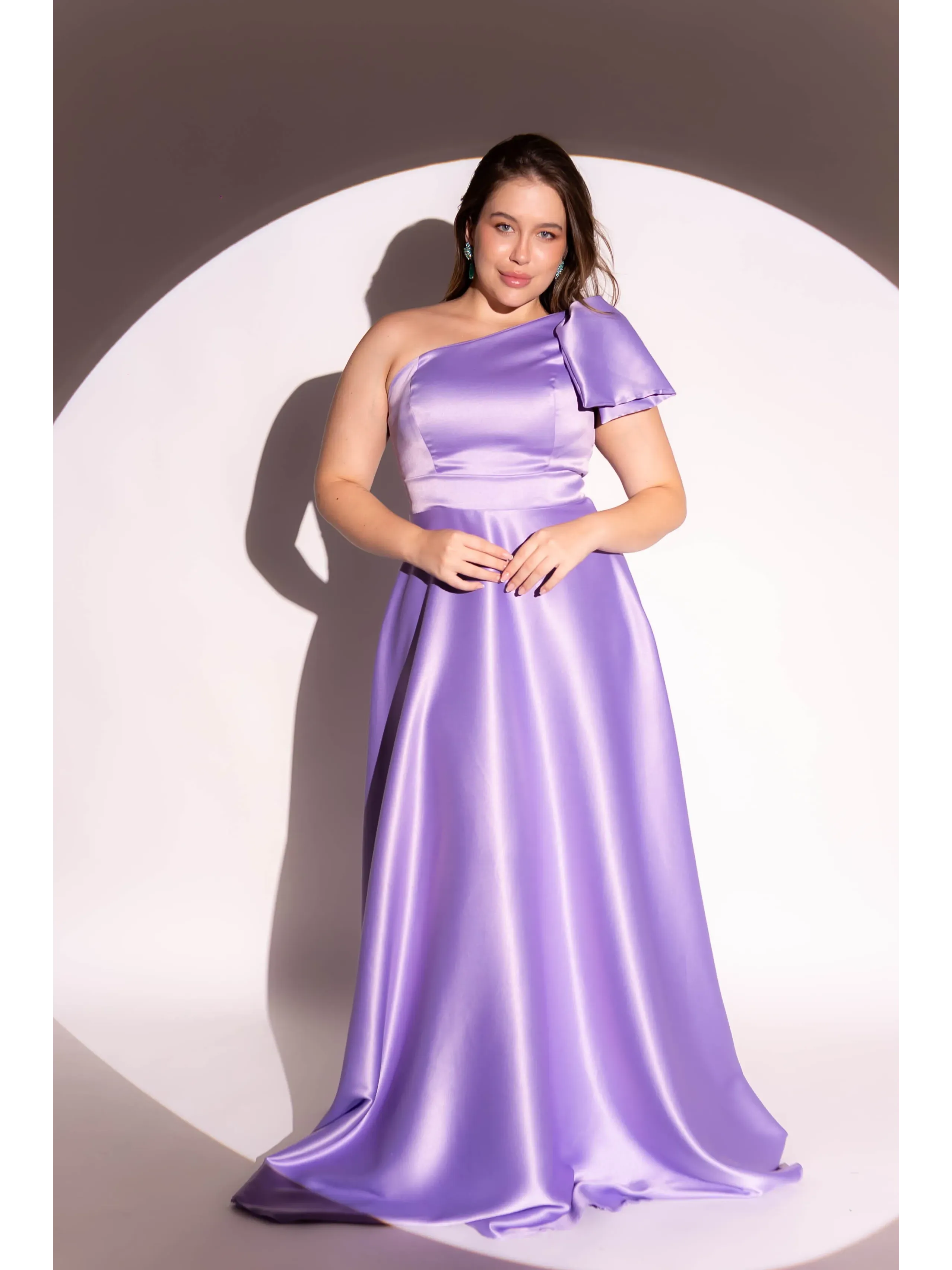 Vestido de festa longo lavanda modelo nula manga com laço no ombro e saia fluida