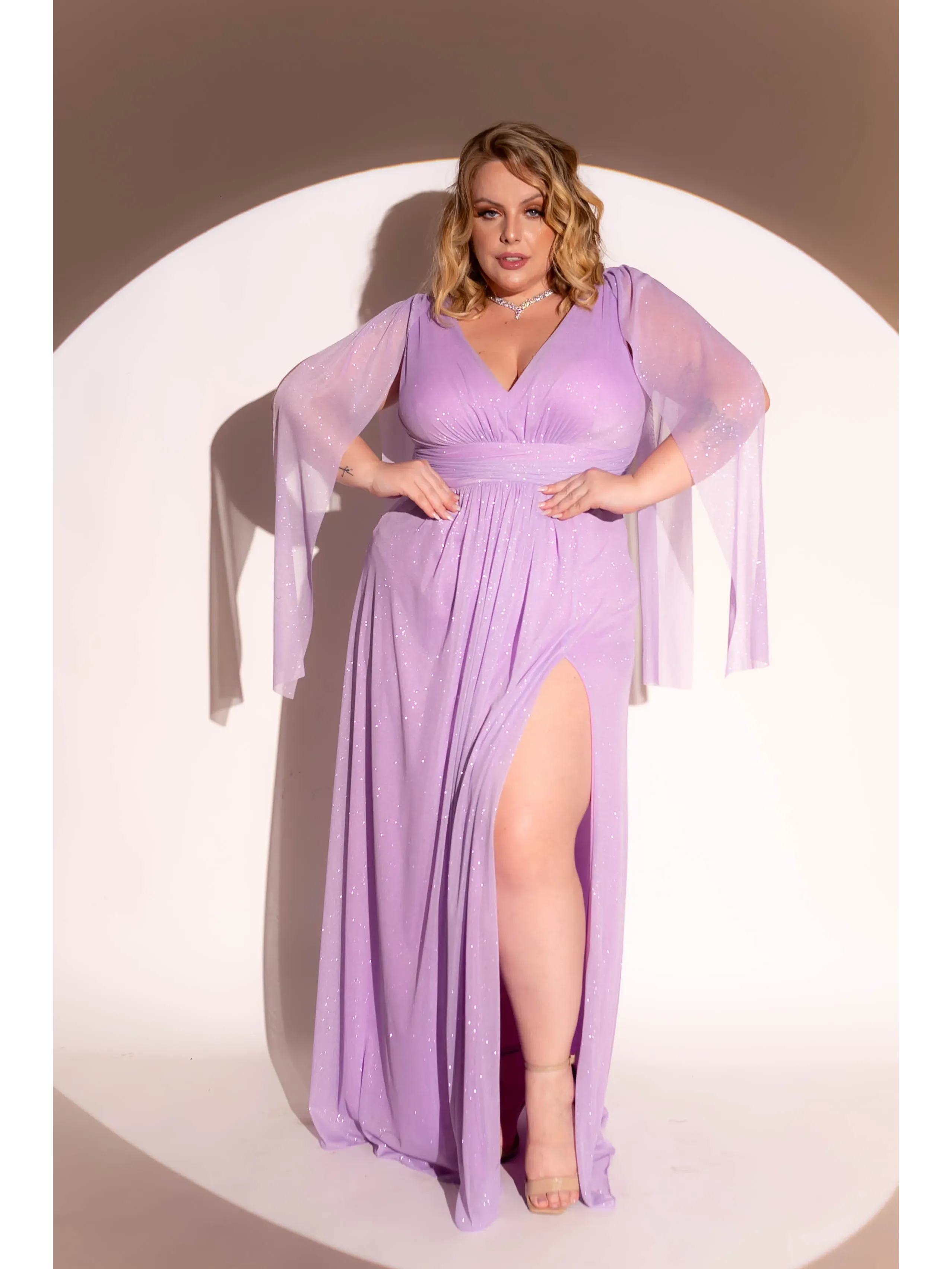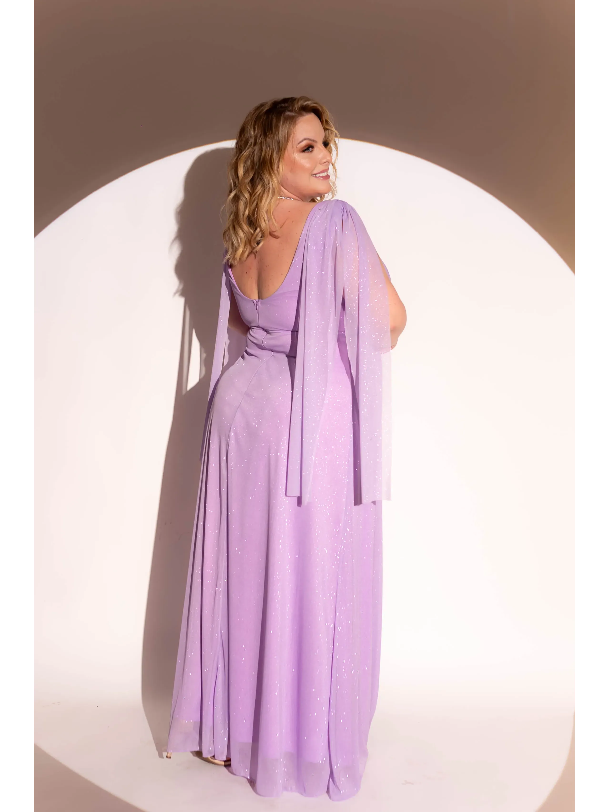Vestido de festa longo lavanda todo em tule de glitter com manga capa e saia com fenda