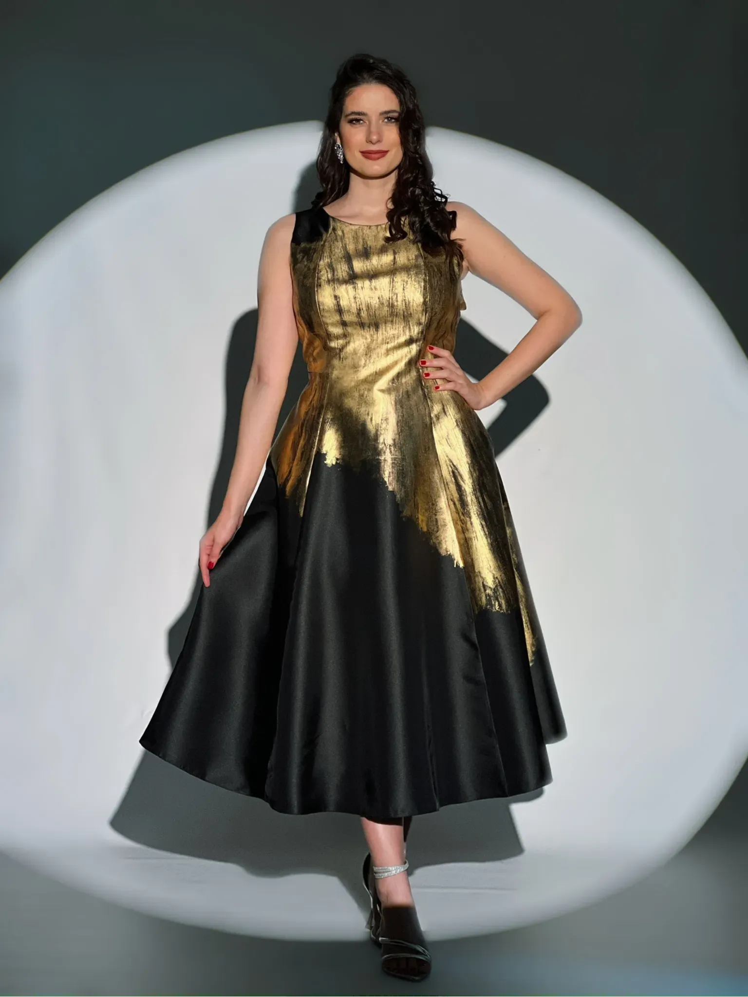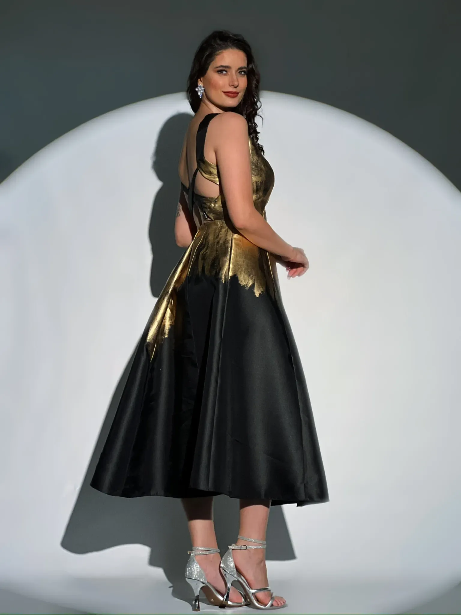Vestido de festa midi preto e dourado com tecido em zibeline