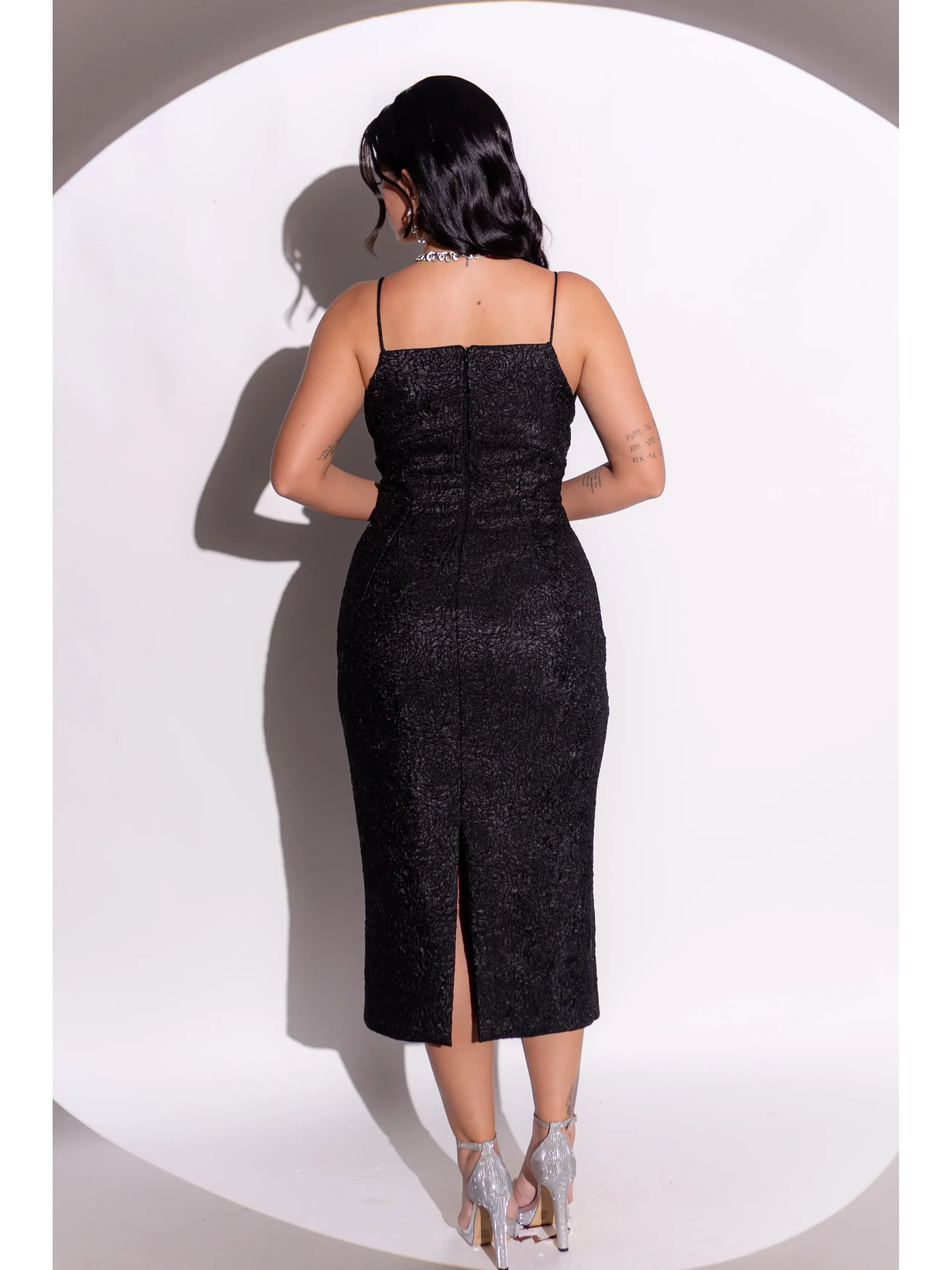 Vestido de festa midi preto justo no corpo com alça fina e decote
